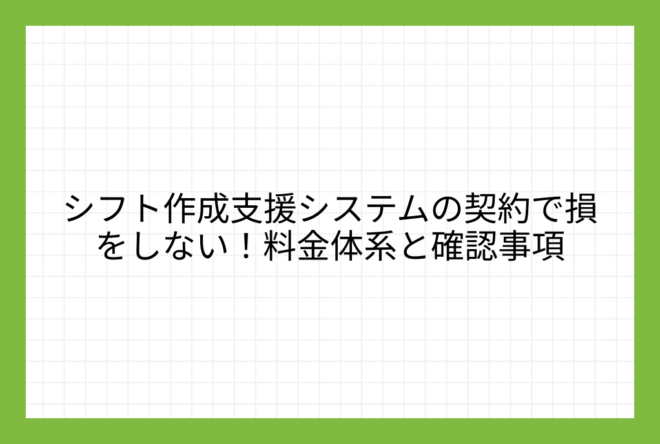 この記事では、システム導入担当者が契約時に見落としがちな料金体系の注意点と、システム導入後に後悔しないために必ず確認すべき契約事項などを解説します。特に、シフト管理システムのトライアルや比較検討を重ね、いよいよ導入するシステムを一つに絞り込み、契約を目前に控えている方は、参考にされてください。